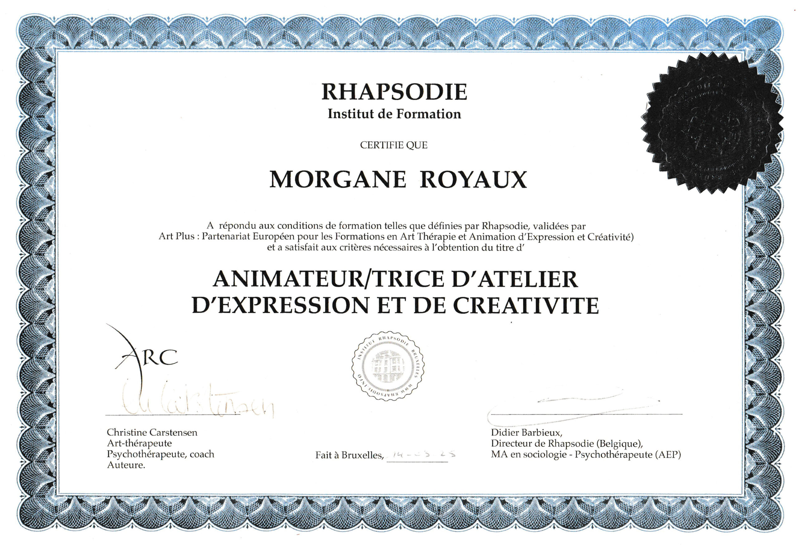 Animatrice d’atelier d’expression et de créativité Certifiée par l’institut de formation Rhapsodie (Bruxelles).