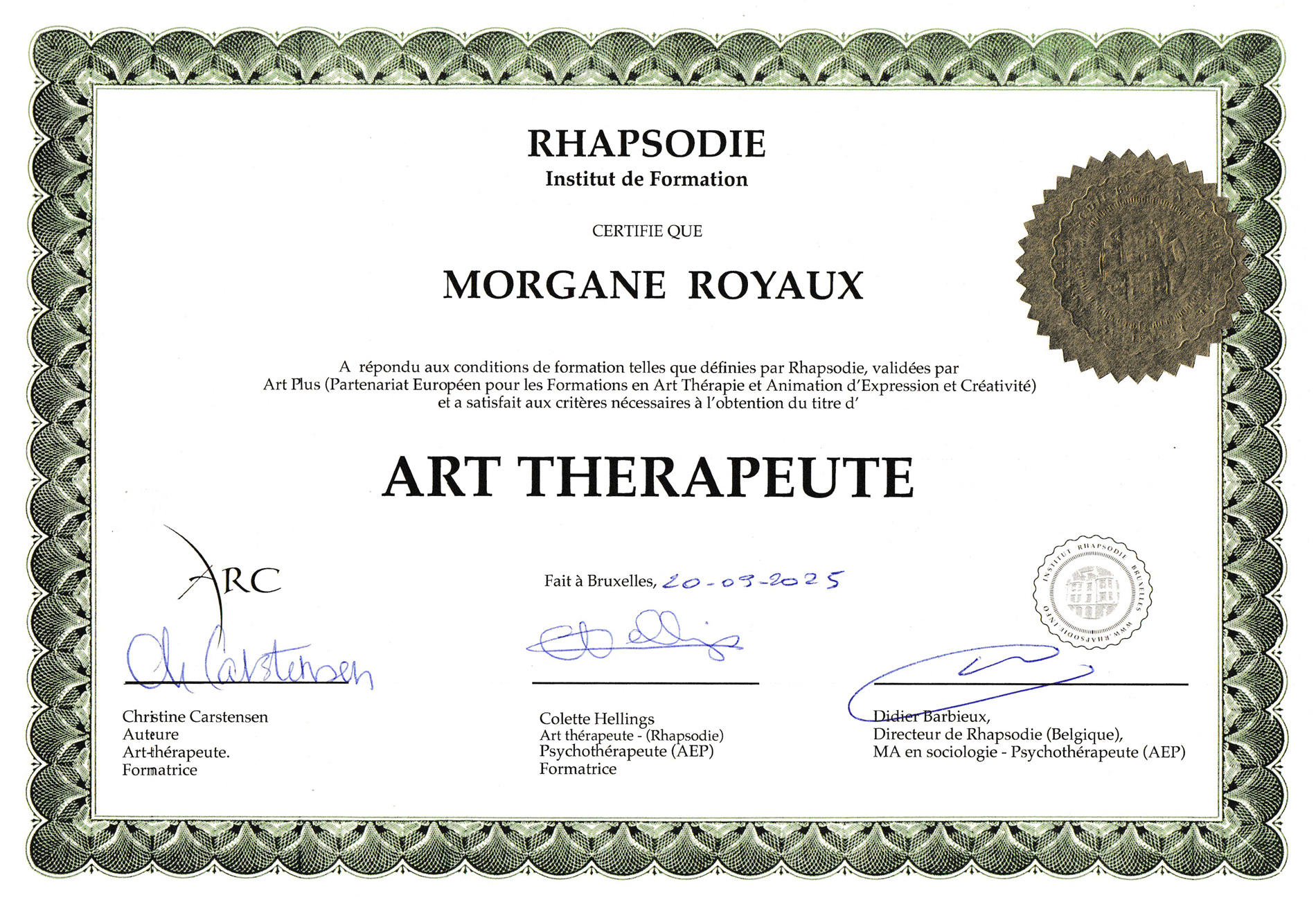 Art-thérapeute Certifiée par l’institut de formation Rhapsodie (Bruxelles), après avoir répondu aux critères de formation validés par Art Plus (Partenariat européen pour les formations en art-thérapie et animation d’expression et créativité).