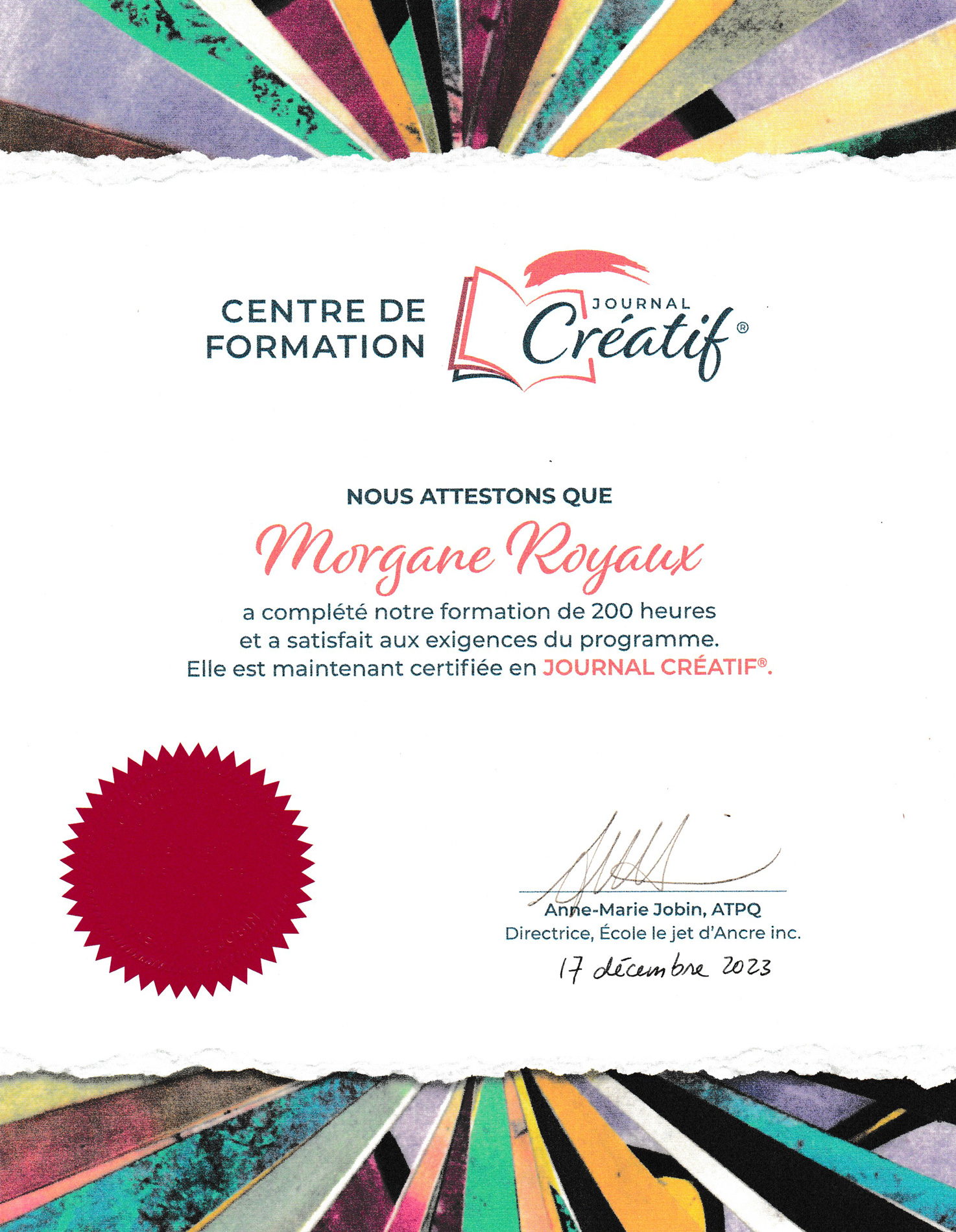Praticienne en Journal Créatif® Certifiée par l’École le jet d’Ancre (Anne-Marie Jobin), après un cursus de formation de 200 heures.